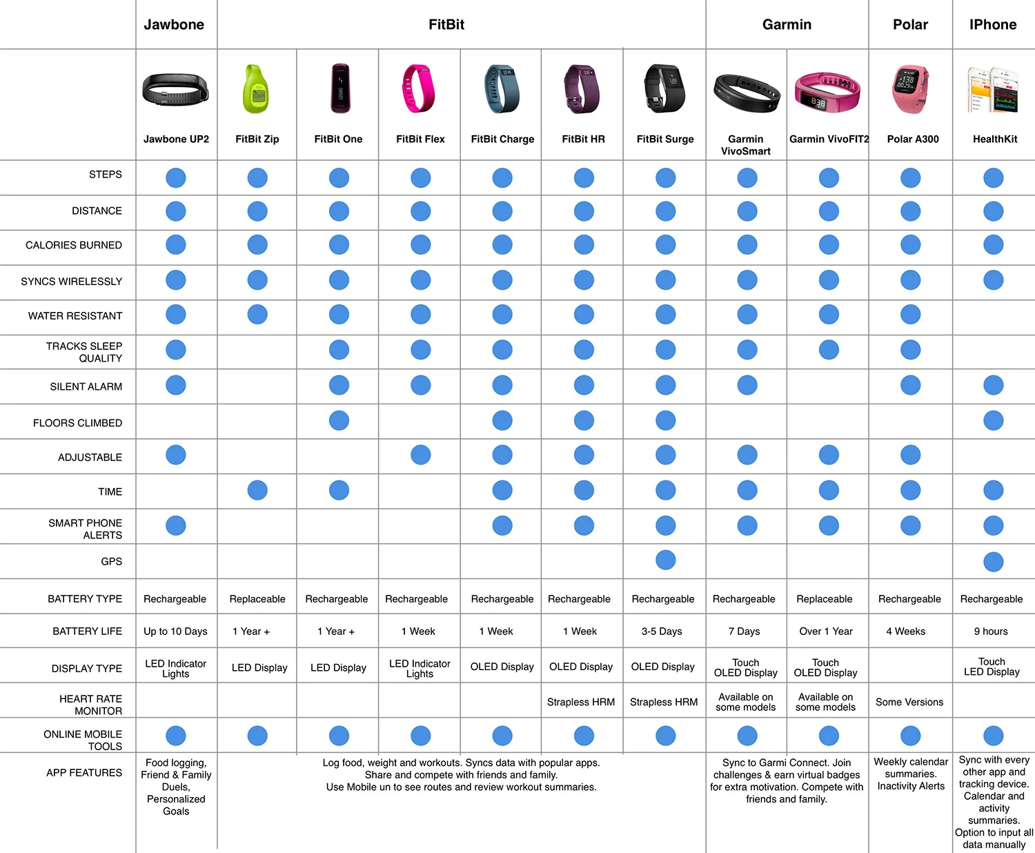 It would be necessary for BWell to draw API data from existing tracking devices to gather employee data. We wanted to start comparing these devices and their platforms to inform the possibilities of our product features. BWell later attained a partnership with Jawbone and Fitbit, which we found to be the most comprehensive devices. Below are my research notes, and comparative analysis