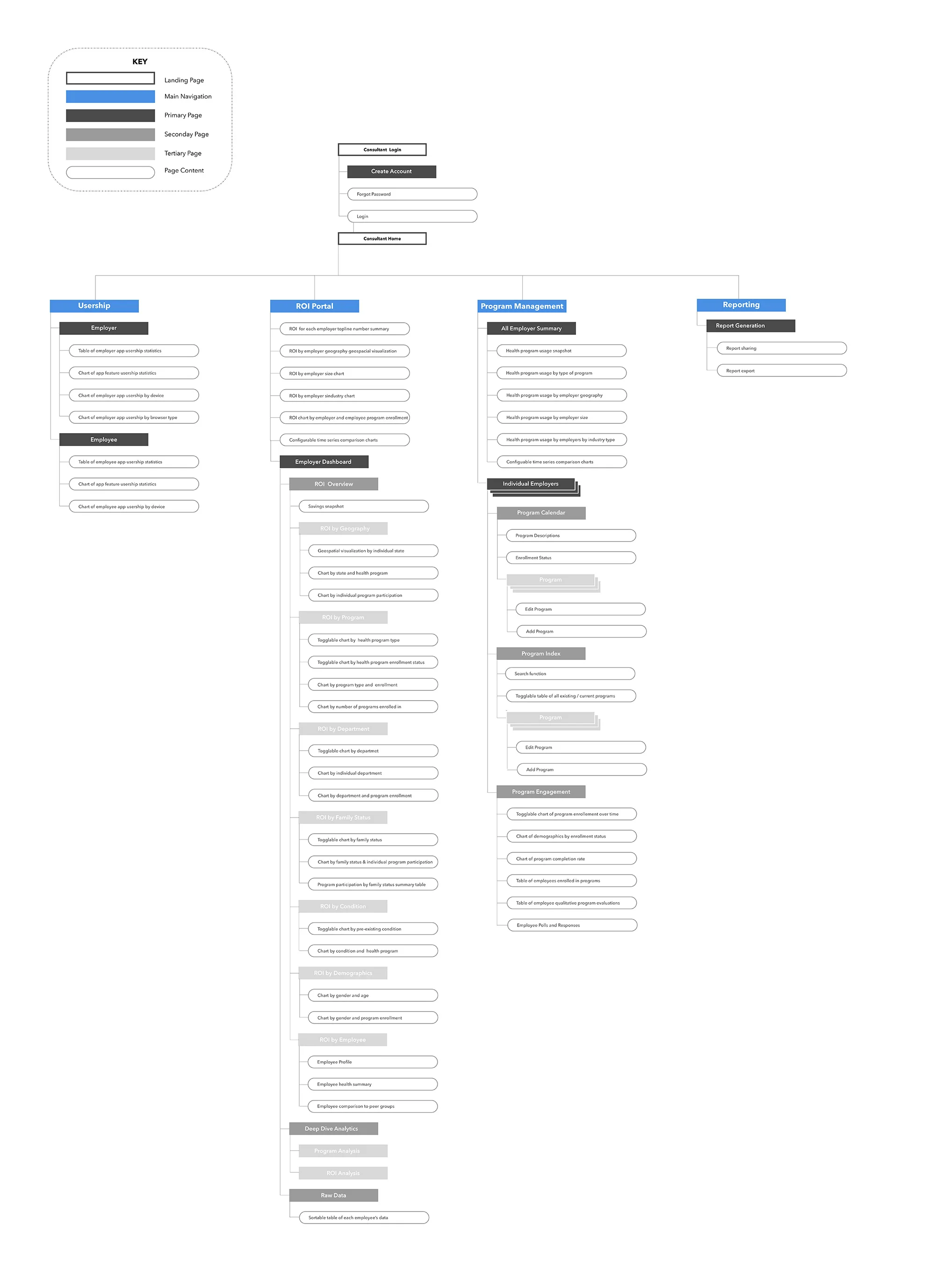 After gathering preliminary research, I wanted to define and understand the users, This would help refine the product goals and help establish an MVP. I began by creating 3 primary personas to represent the distinct users of this app: The Employer, the BWell Consultant, and the Employee. My research also influenced the need for 2 further personas using the Employee User Interface; the Employee's Dependent, and the Reluctant Employee.