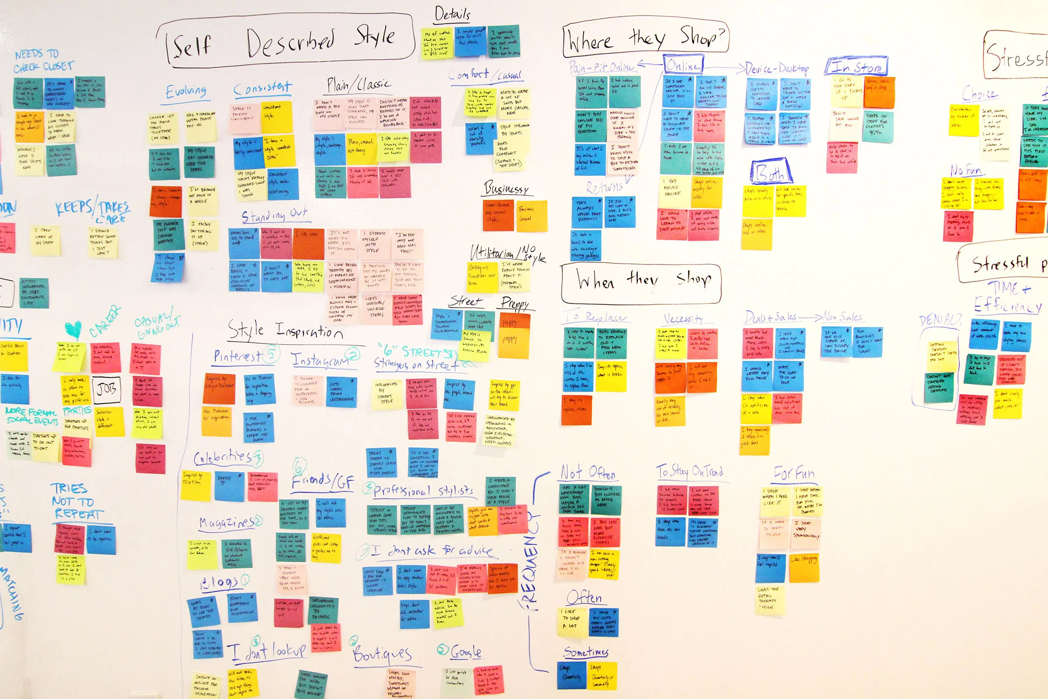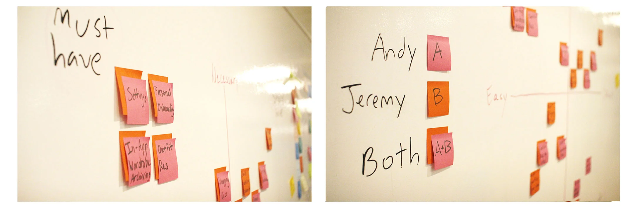 We synthesized all of our data from user interviews through affinity mapping. We discovered that we could organize our user's needs into two distinct groups. It was important to remember that we were designing for real people, so we created characters based on these groups; The Average Joe who needed help discovering clothing and putting together outfits, and The Stylish Guy who wanted a tool for archiving his wardrobe and favorite outfits. We then created a series of stories for each user, based on his individual needs. This would inform our feature prioritization and design strategy.