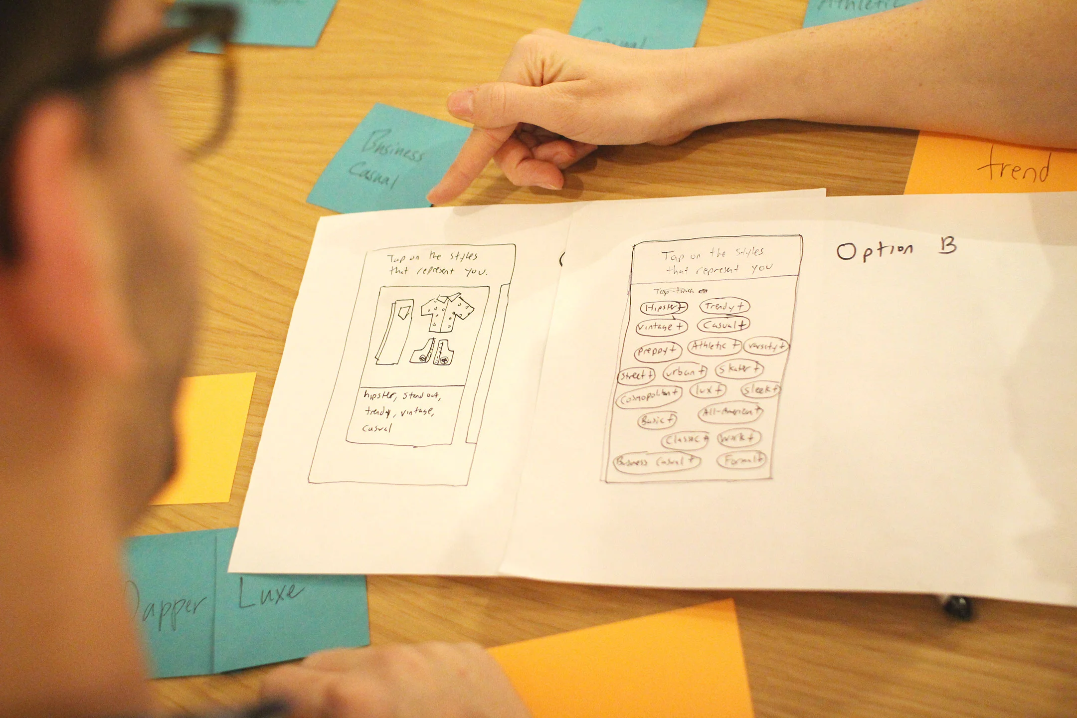 While card sorting we found that a few users were unfamiliar with many of the terms used to define style, or would define them differently. For instance, what some users defined as 'casual' others would describe as 'preppy'. We needed to know how to represent specific style categories so that they could be easily and accurately identified by our users. We wondered if it might be easier to use visuals rather than terms to represent different style categories. We sketched two paper prototypes of user interfaces for this part of the on-boarding. User's ultimately felt that using visual combinations (A) felt too restrictive compared to choosing individual terms (B).