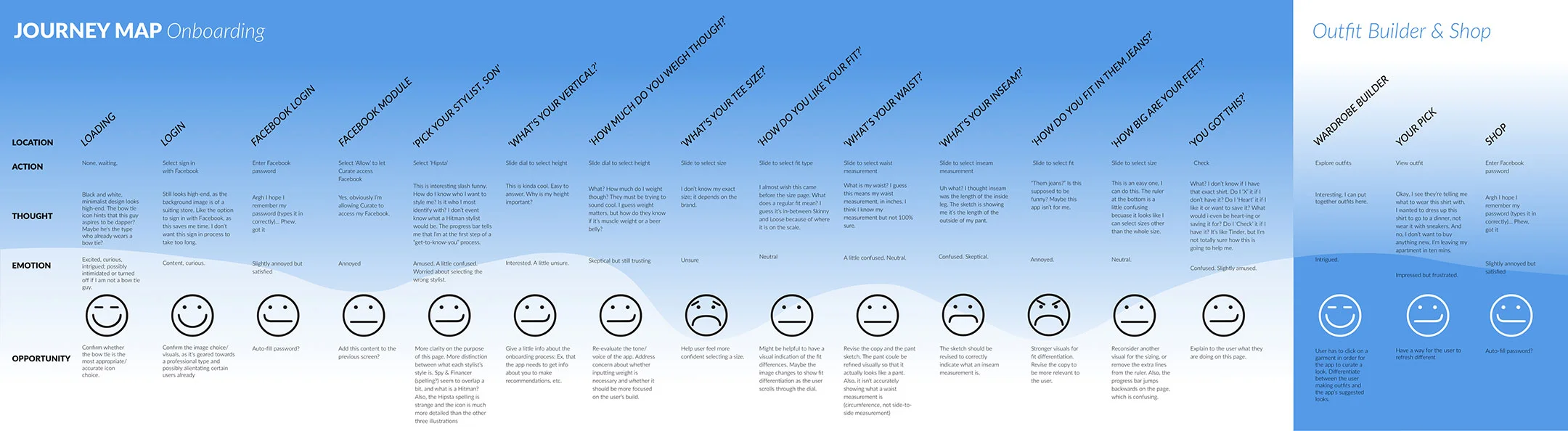 The initial research began by evaluating the current app in detail. Our team developed a journey map to illustrate the user's thoughts and emotions throughout the on-boarding and wardrobe building processes in order to identify its weak points and discover new opportunities. We found that the emotional curve of our user is the most positive upon opening the app. As the user continues the discovery phase, their expectations are not met, leading to increased levels of frustration, confusion and dissatisfaction.