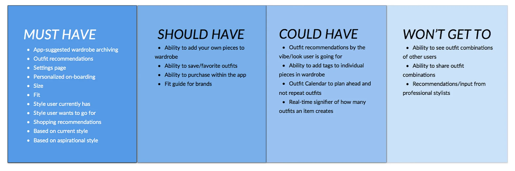 Where do we start? The MSCW method helped to prioritize features based on necessity and level of difficulty for both the users and the business. This would help us to focus on the base features that would be necessary to create a beta MVP which could be tested and developed further through future iterations.
