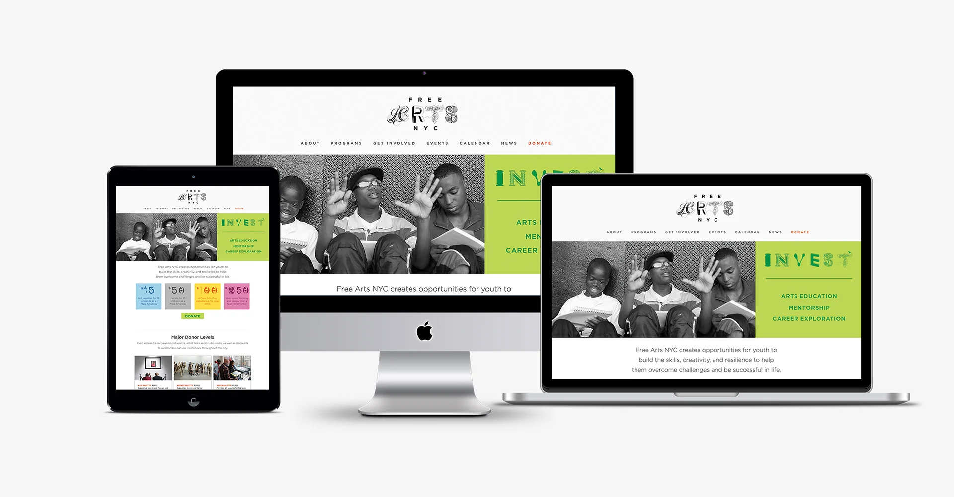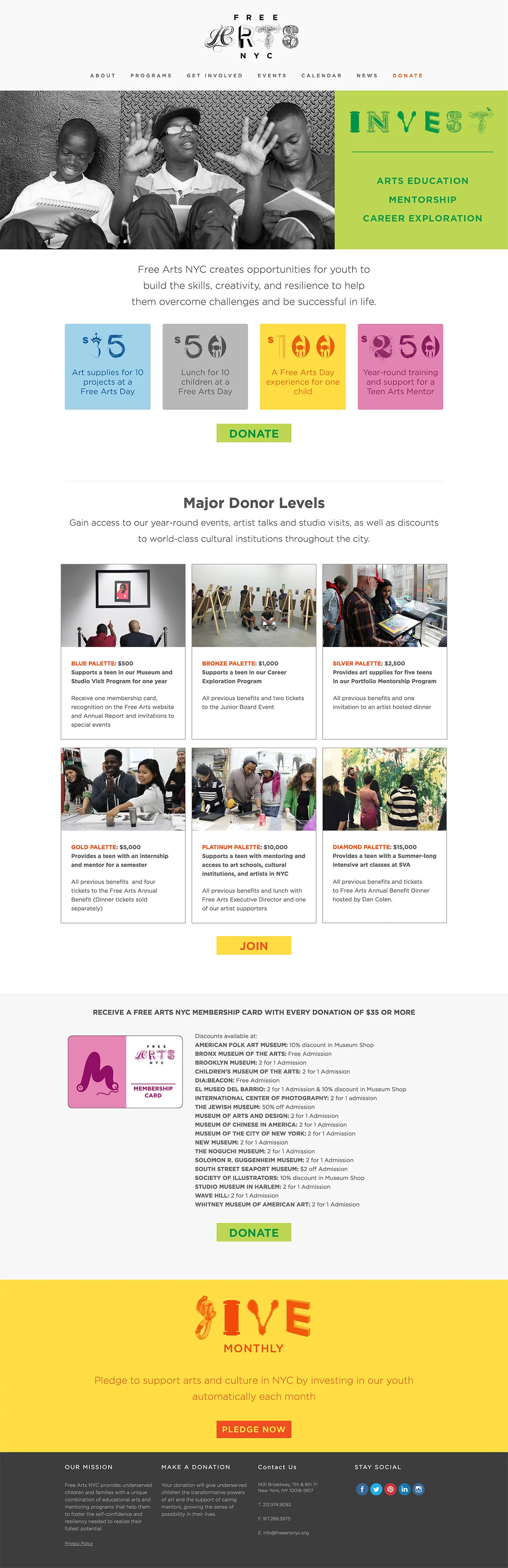 Free Arts NYC was founded in 1996 as an arts based non-profit for underserved children and families living in NYC. The organization partners with NYC artists like Chuck Close, Barbara Kruger and Christopher Wool to provide arts education, mentorship, and access to cultural institutions in NYC. The 2017 Annual Campaign was positioned primarily in the digital space. Using Jakob Nielsons's method of heuristic analysis, I redesigned the central donation page to provide a more user-friendly experience while helping Free Arts meet its donation goals. Limitations involved working within the constraints of the existing site's Wordpress template.