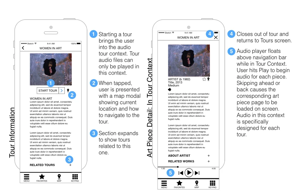 Considering the elements and features we needed, we developed screens for exhibition and tour information, along with screens for each piece of artwork. A map screen was included, as were screens for favoriting pieces, entering an artwork's corresponding wall number, and for search. An audio option was included for informational text associated with each piece.