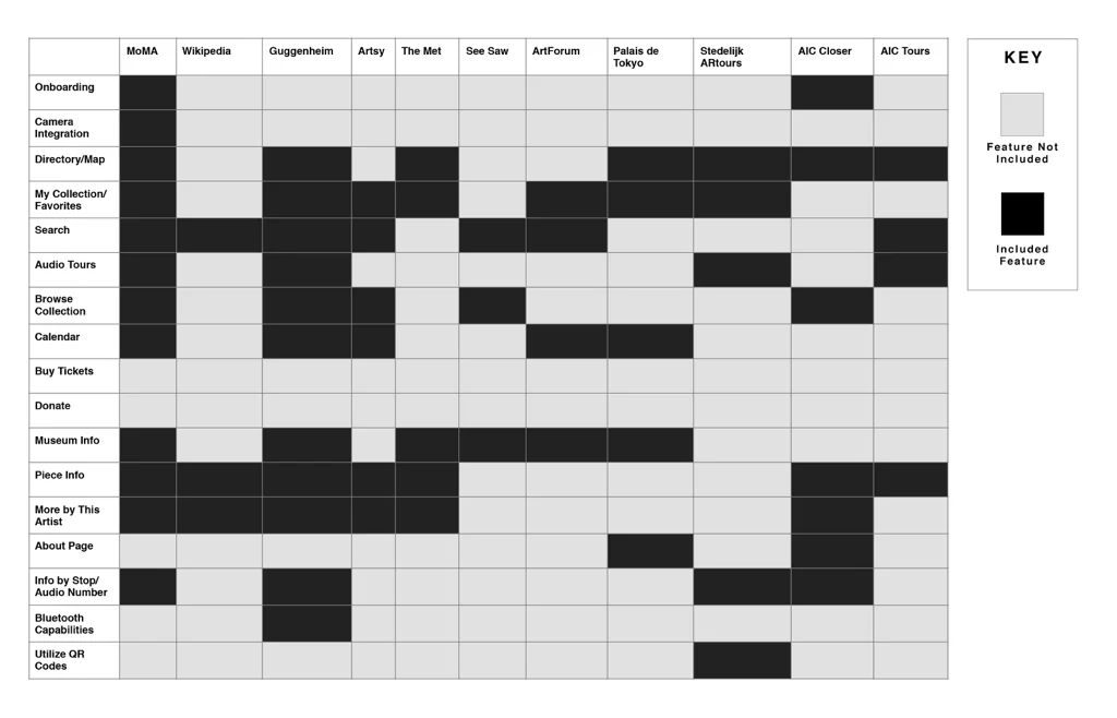 PS1 is competing with museums in New York City, as well as contemporary art museums worldwide. Each of the competitive museums offer companion apps. Thus, visitors who are familiar with PS1 competitors will also expect to find a companion app at PS1. We conducted a feature analysis to determine which features populate the competitive space. Most of the competitors offer a digital map, some of which are dynamic. All include general museum information. Many include a way for visitors to save, collect, or ‘favorite’ pieces. The audio tours offered are usually very short and equivalent to the tours offered on traditional handsets - a gap in the market (we discovered users desired a variety of tours catered to their particular interests). Most competitors gave info about individual pieces, some of which could be accessed individually by entering a number.