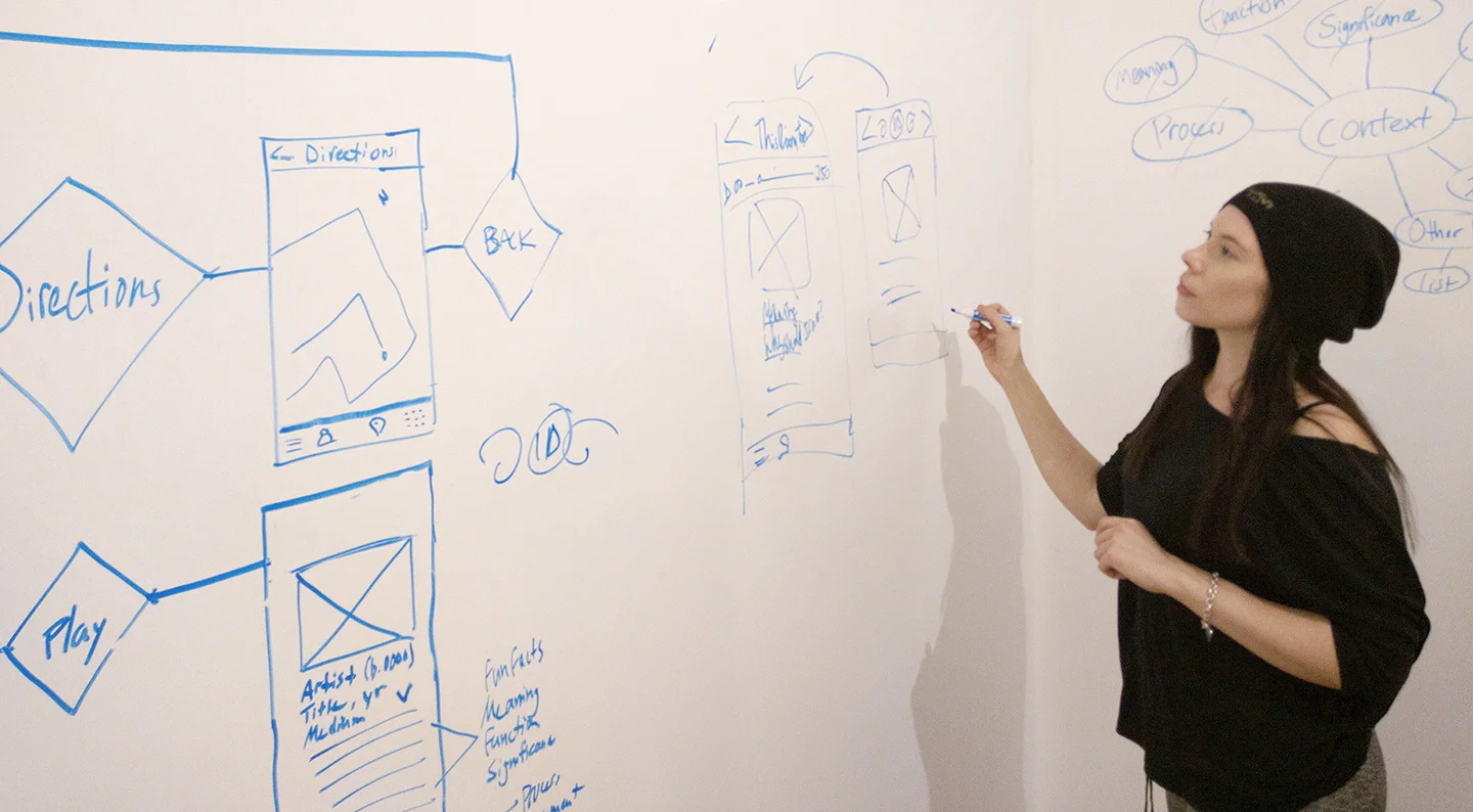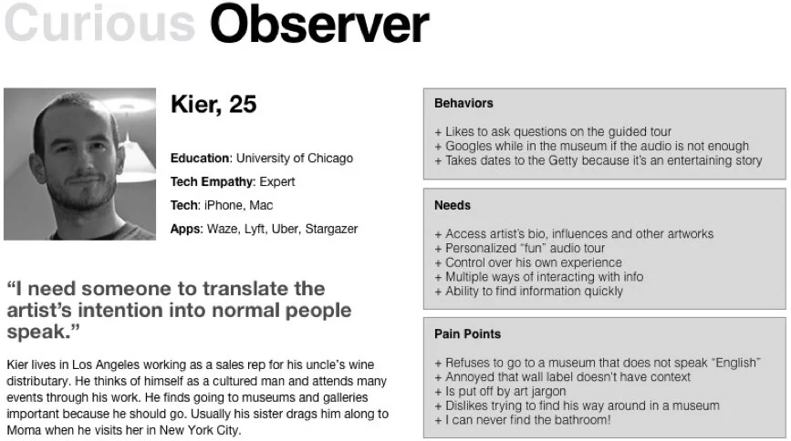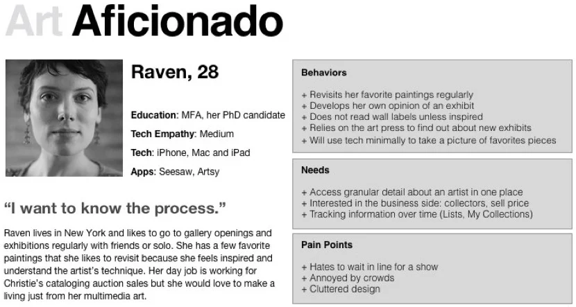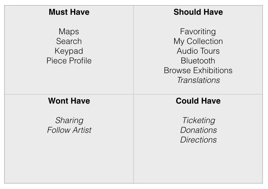 Once the personas were created, the Moscow Method was used to do a feature prioritization. Based on our research, it was necessary to include museum maps, a way for visitors to enter an art work into the application for more information, and a way to present the information for each work. Other features we felt should be added based on user needs were audio tours, a way to favorite or bookmark a piece to access information later, and Bluetooth location services. Since the art was still the main focus, it was necessary that we allowed users to gain information while having a "heads up" experience whenever possible. Essentially, we realized it would not be to the benefit of a museum visitor to have to keep his or her eyes glued to the phone, so interactions should be quick and we should offer audio when possible.